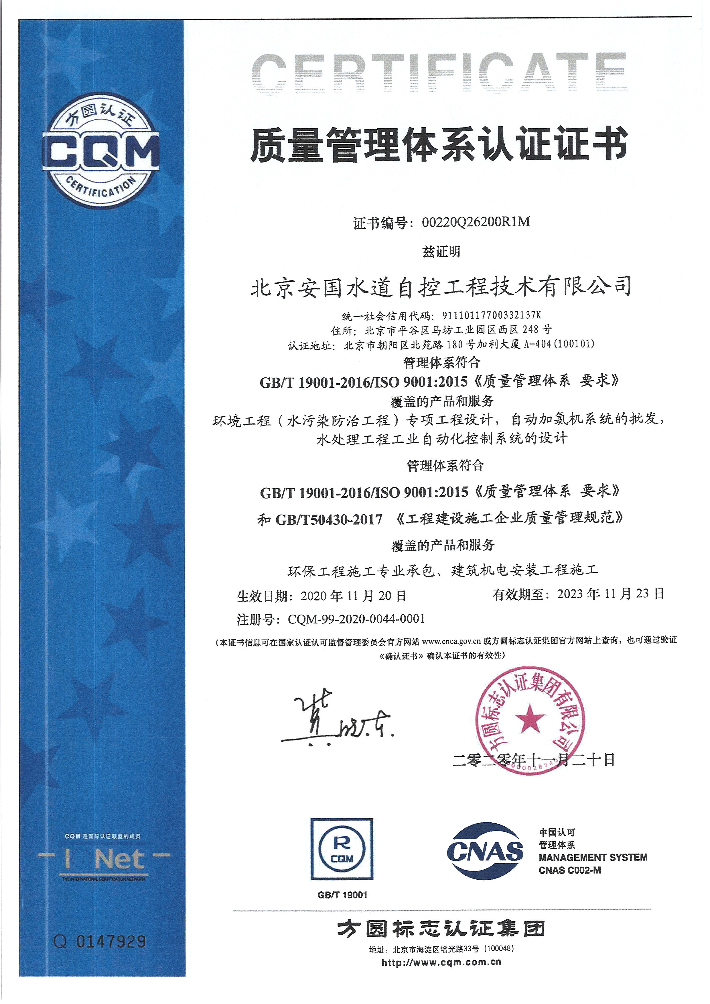 背景安國水道自控工程技術有限公司是注冊在北京市平谷區馬坊工業園區的高新技術企業,是中國水處理行業及自控領域的知名企業,在凈水廠、污水廠、循環水廠的水處理方面擁有國內領先的工藝技術及調試經驗。